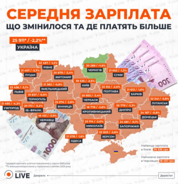 Последние статистические данные показывают, что украинцы зарабатывают чуть меньше, чем месяцами ранее. По данным Государственной службы статистики, в августе 2025 года средняя зарплата по стране составила 25 911 грн, что на 2,2% ниже, чем в июле.